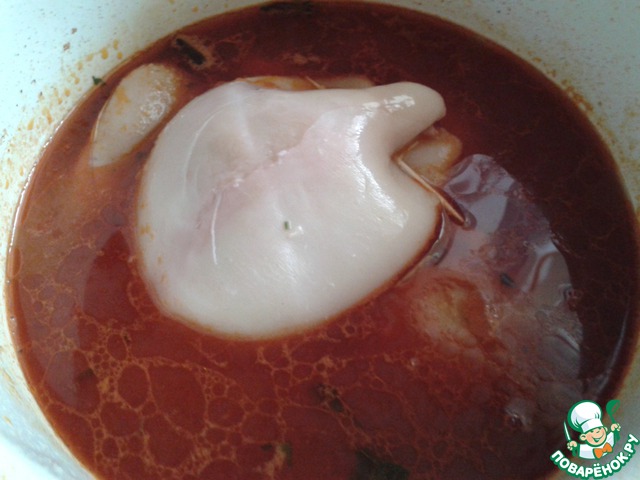 | Интересный рецепт на ужин для гостей, удивит и околдует интересным вкусом кальмаров сюрпризом внутри него, с нотками гвоздики. |