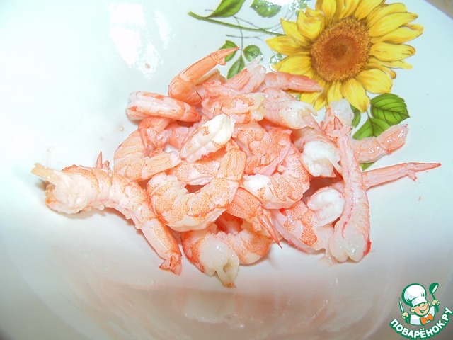 Креветки разморозить, почистить (не забыть удалять чёрные прожилки на спине). Все очистки складывать в чистую кастрюлю.
