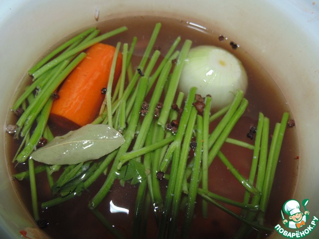 В кастрюлю с очистками налить воды, добавить стебли петрушки, перец горошком, лавровый лист, целую луковицу и почищенную морковь, посолить. Поставить на огонь, после закипания убавить и варить примерно 20-25 минут.