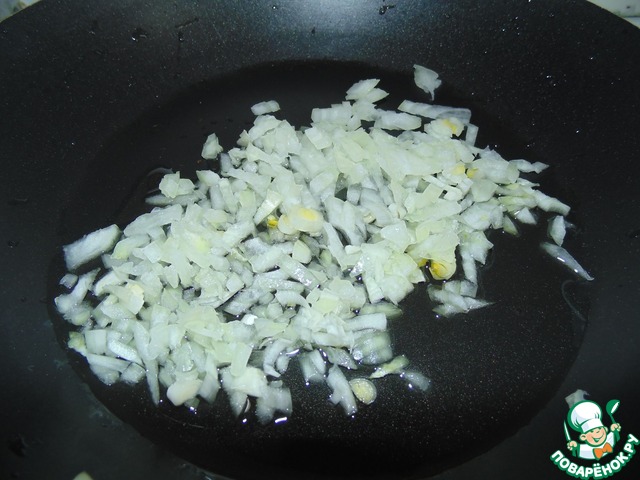 Маленькую луковичку или половину средней, очень мелко порезать. Выложить на сковородку с растительным маслом и обжаривать до прозрачности.