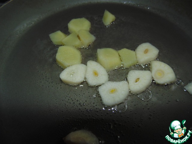 Пока готовится рис, ставим на огонь маленькую сковородку, наливаем растительное масло и обжариваем крупно порезанные чеснок и корень имбиря.