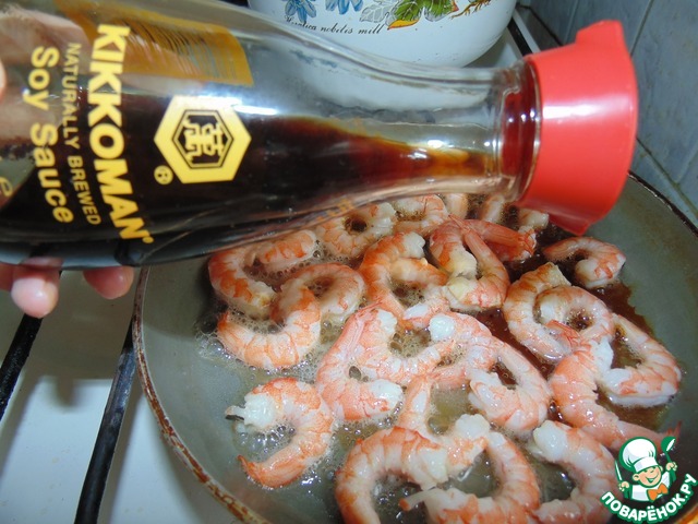 В ароматное масло выложить креветки и полить их соевым соусом Kikkoman. Обжаривать примерно 30 секунд.