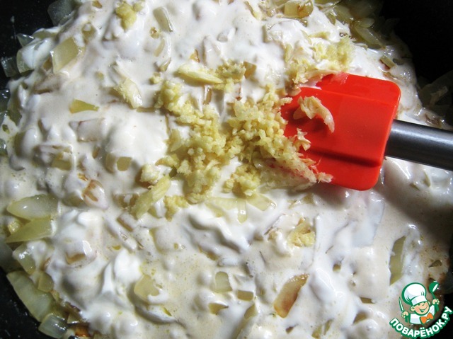 Добавляем сливки, раздавленный чеснок и черный перец. Перемешиваем, ждём, когда закипит.