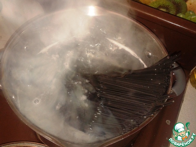 Спагетти берётся, примерно, 65 г на порцию. Отвариваем в кипящей воде из расчёта: на 100 г спагетти 1 литр воды и 10 г соли (можно добавить ложку оливкового масла). Я это делаю так: как спагетти закипят, варю 6 минут, вливаю кружку холодной воды, отключаю плиту (у меня электрическая с конфорками), накрываю крышкой и оставляю ещё на две минуты;