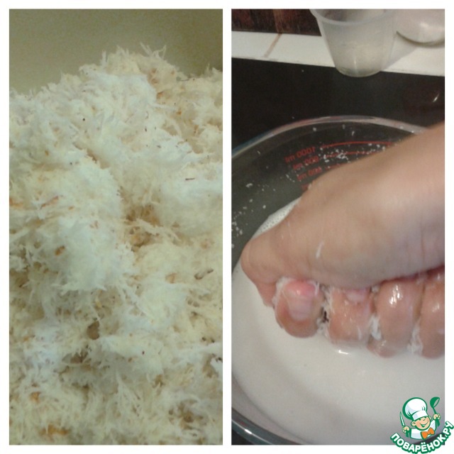 Добываем кокосовое молоко. Кокос натираем на самой маленькой в мире тёрке или просто покупаем стружку, если есть возможность, опускаем в воду и хорошенько выжимаем молоко из стружки. Выжатую стружку выкидываем, молоко пропускаем через самое мелкое сито, отжимаем застрявшую в сите стружку. Если используете кокосовую пасту, то разведите её водой так, чтобы вкус был всё еще насыщенным.
