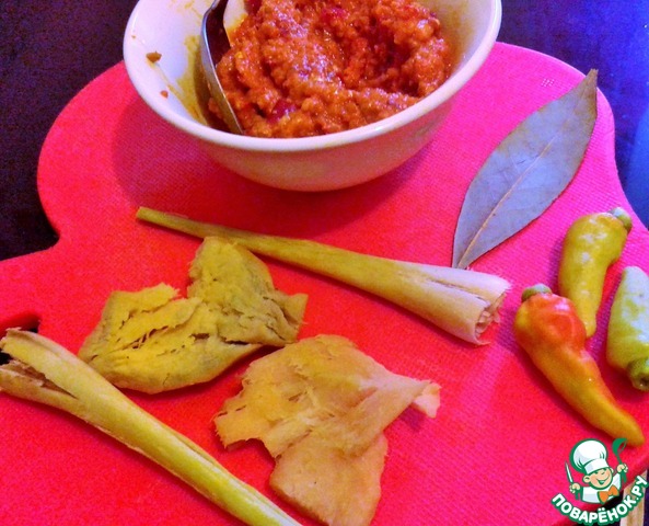 Лемонграс, имбирь и галангал в данном случае на фото нужно раздробить, но так, чтобы они сохранили форму, я в Азии живу уже несколько лет и еще не видела, чтобы имбирь нарезали мелко кубиками или натирали на терке. Остальные компоненты перетирают в каменной ступе в пасту, добавив соль, можно взбить в блендере. Перец чили очистить от семян и добавить по вкусу, также можно добавить лавровый лист.