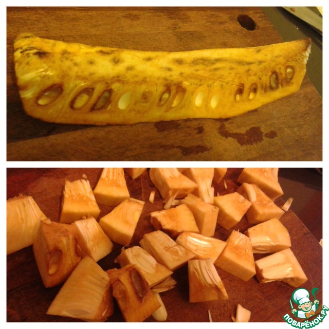 Вот так продаётся джекфрут на рынке, может в Москву уже завозят, не знаю, на всякий случай опишу что с ним делать. При разделке используйте одноразовые перчатки или пакет, свежая мякоть очень липкая. Режем на небольшие кусочки и отвариваем в подсоленой воде 20 минут.