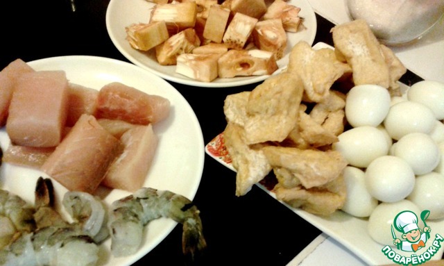 Вот ингредиенты в готовом виде, рыбу режем, не жарим, креветки тоже. Отставляем в сторону.