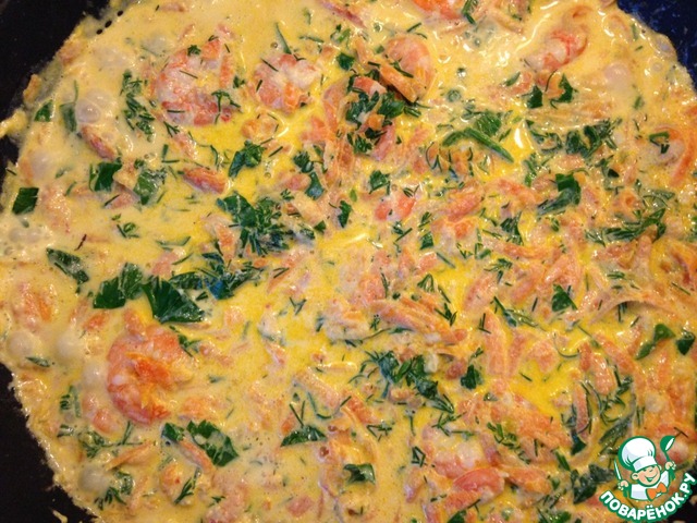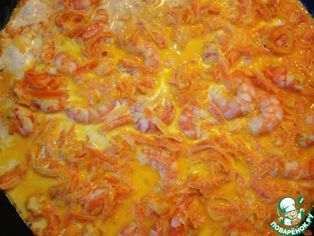 Добавляем креветки и жарим 7 минут (Простите, фото с креветками в сковороде сделать забыла).