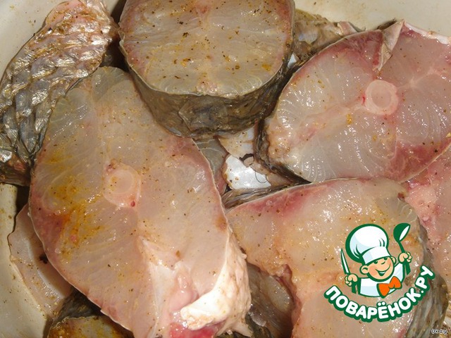Рыбу очистить, выпотрошить, промыть, порезать на порционные куски (1,5-2 см, не толще). Голову и хвост я оставила для ухи.