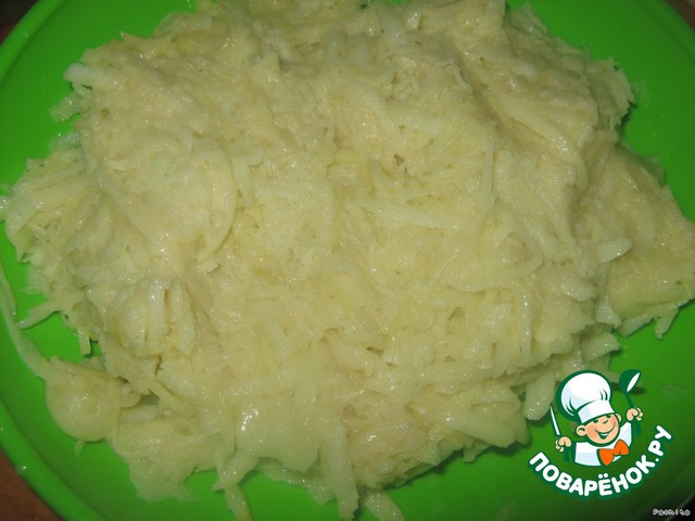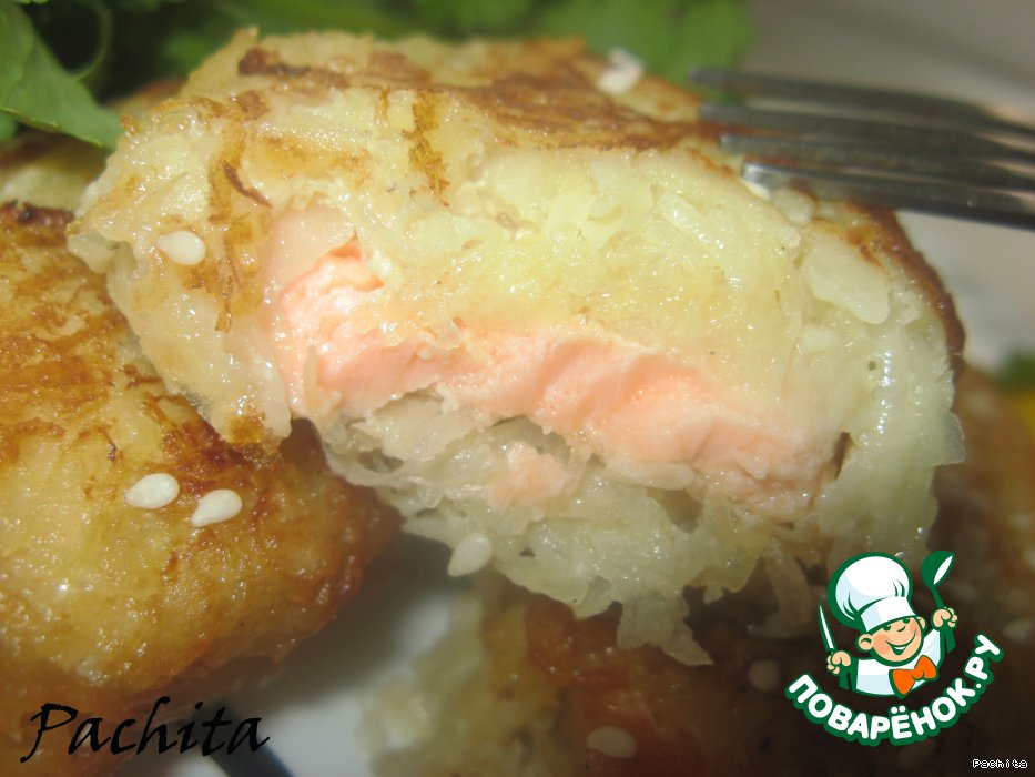 Облепить кусочек рыбы картофельно-яблочной смесью со всех сторон.