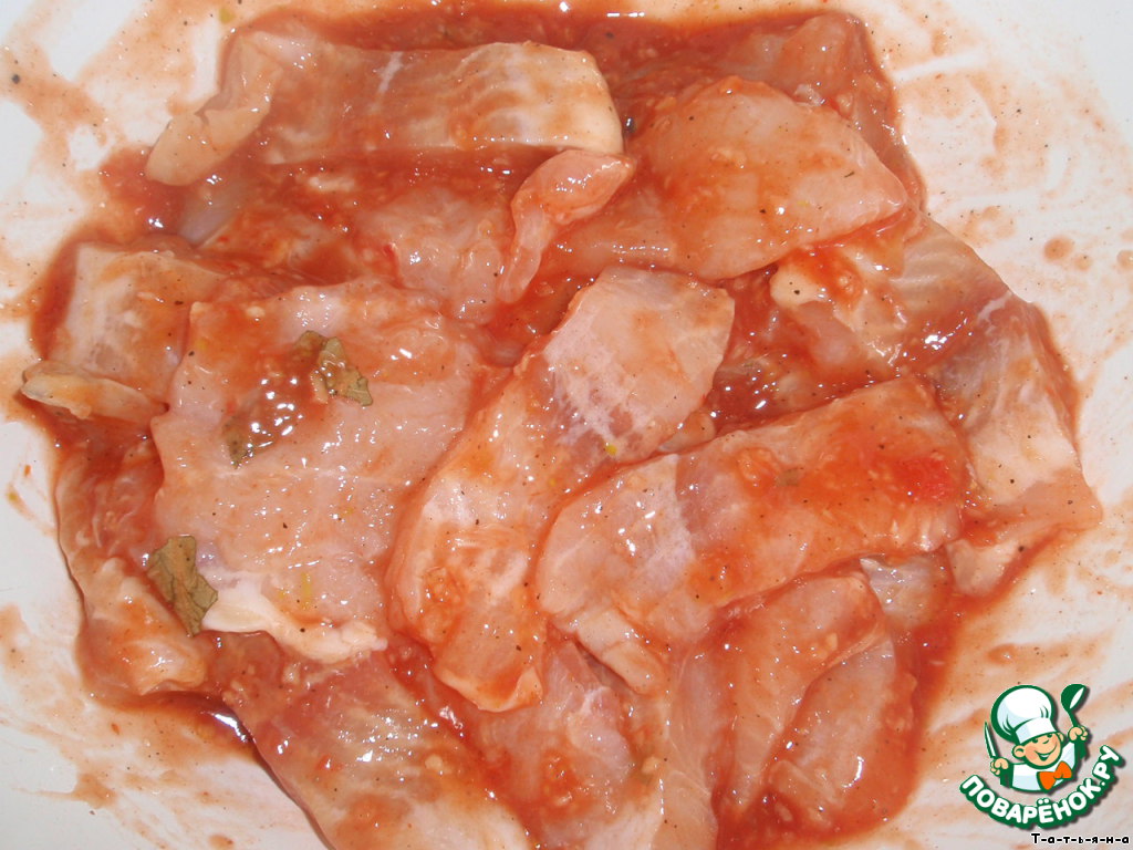 Приготовим маринад: в газированную воду положить томатный соус, измельченный чеснок, лавровый лист, соль, перец и перемешать.