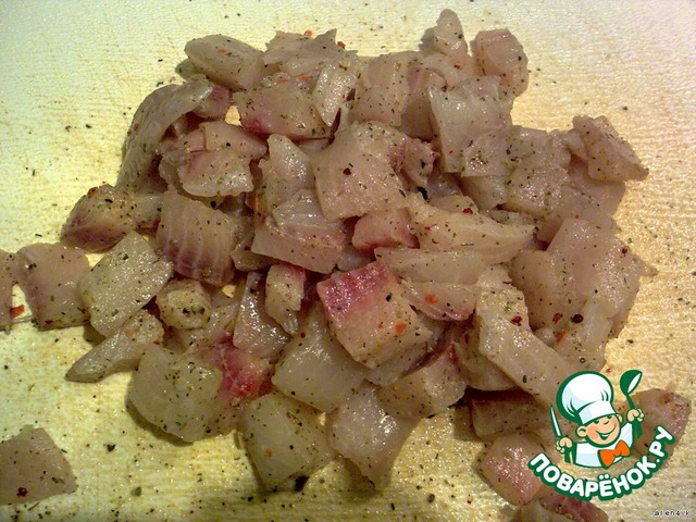 Рыбное филе нарезать кусочками. посолить, поперчить по вкусу. Добавить рыбную приправу