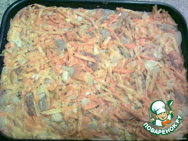 Далее снова морковь вторую треть, остаток рыбы и лука. Последний слой моркови