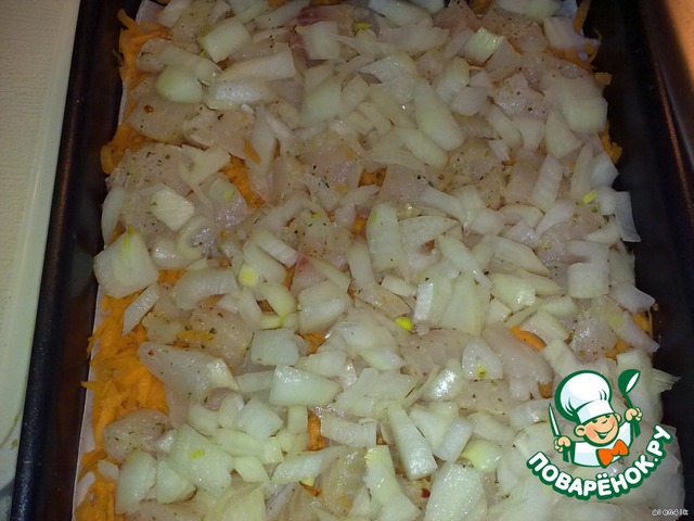 В форму, выстеленную пергаментом (можно и без пергамента, но у меня форма с покрытием, и не хотелось потом ни ножом, ни лопаткой царапать) выкладываем 1/3 часть моркови, сверху половину рыбки и половину лука.