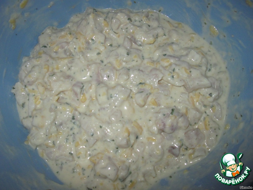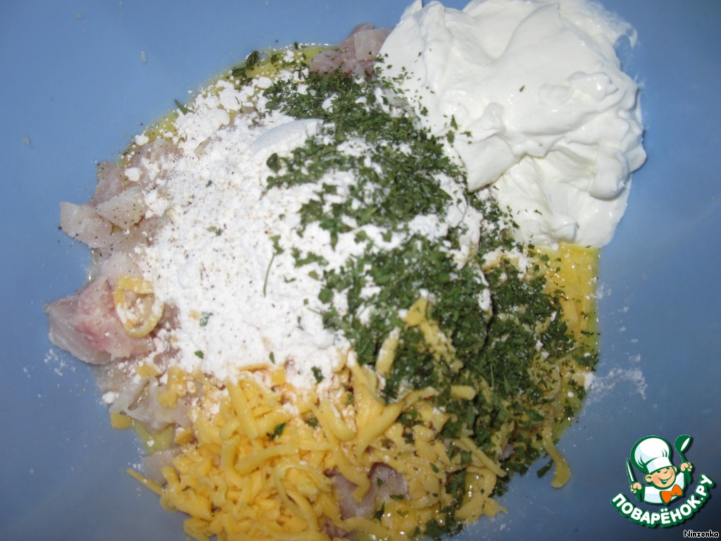 Добавить сыр, яйца, петрушку, сметану, муку, соль и перец к рыбе и хорошенько перемешать.