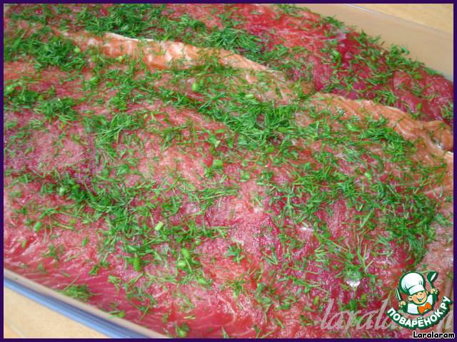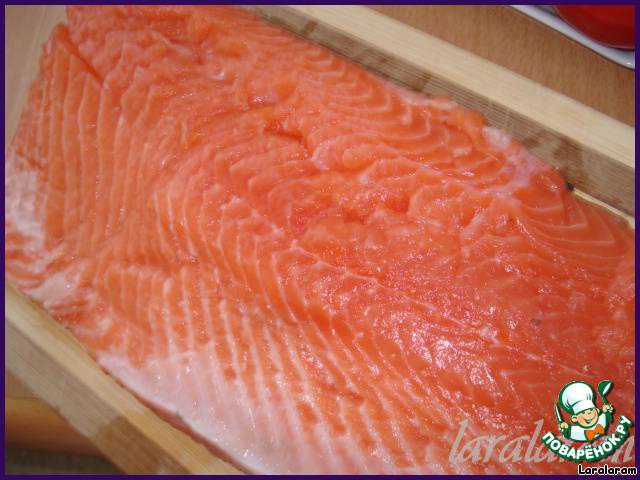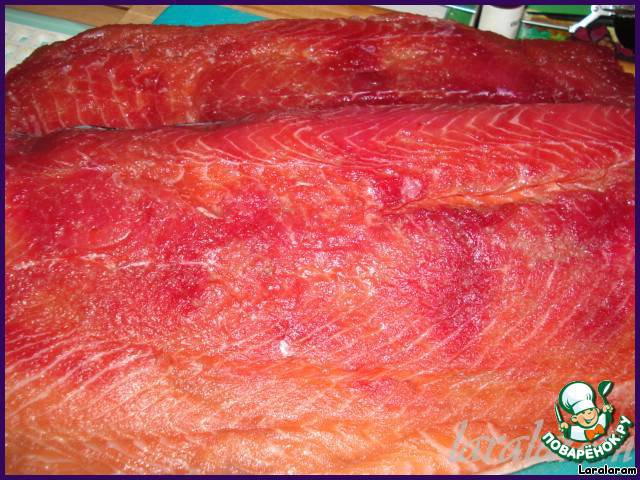 Кладём смесь толстым слоем на каждое филе (у меня ушло по 4 ст.л. соли и сахара на каждую половинку). Тут вроде и всё - но я делала ведь красную-красную рыбу!