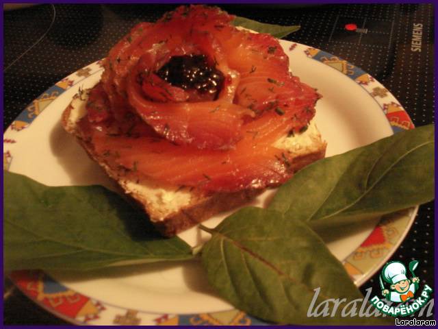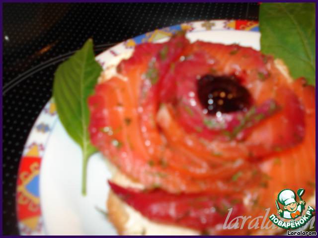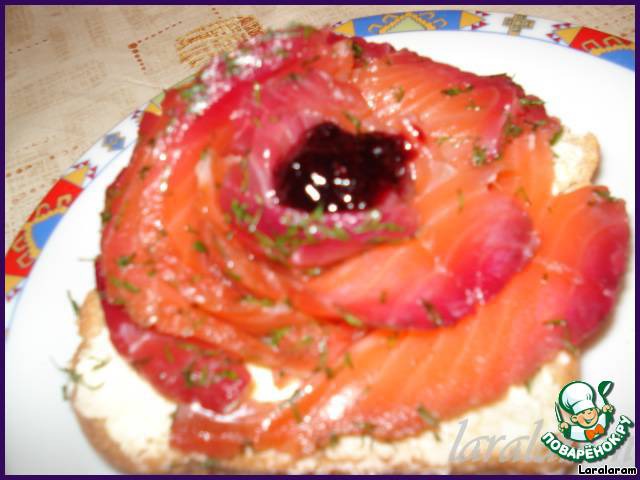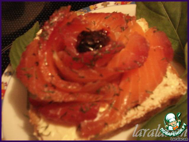 Итак, на кусочки хлеба, тонко смазанные маслом, выложить кусочки рыбы, формируя розочку. Края можно "макать" в мак, молотые орехи, кокосовую стружку (получится иней на краях лепестков), но я так не делала, так как моему мужу семечки и орехи, видите ли, в зубах застряют! В серединку я положила 1/2 ч.л. чёрной смородины, перетёртой с сахаром (я ведь экстремалка!), а для гламурности можно чёрную (а можно и красную!) икру, а также горчицу, смешанную с мёдом… Ну, что ещё? Придумайте дальше сами!