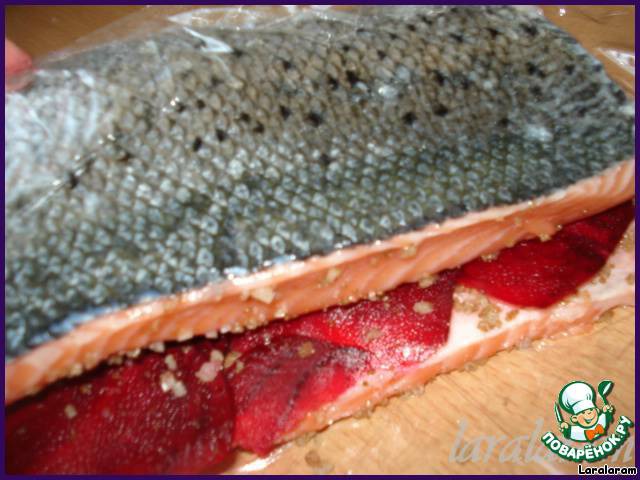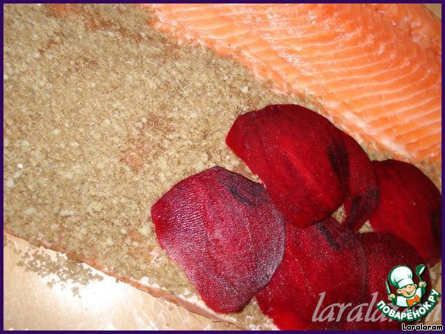 Свёклу моем и чистим! На шинковке нарезаем тонюсенькие кружочки и кладём их в виде чешуек на одно филе. Филе кладём друг на друг (ну, вы знаете, как оно бывает-то, друг на друга!).