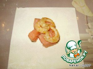 На тесто положить несколько кусочков рыбки и сверху пару штучек креветок.