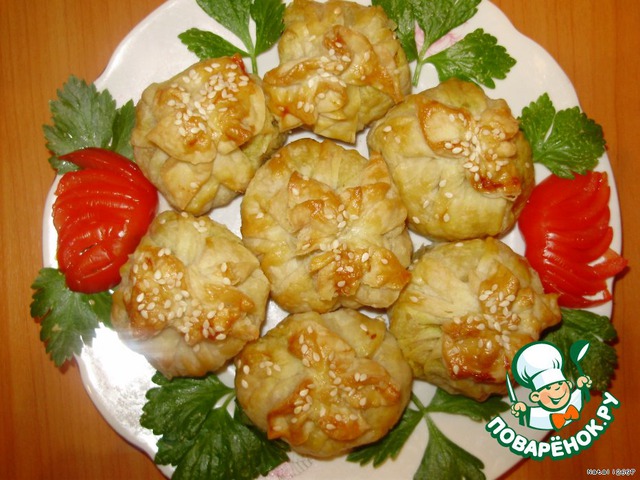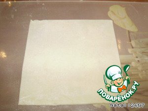 Слоеное тесто тонко раскатать и нарезать на квадраты,