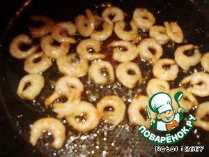 Очищенные креветки обжарить на небольшом количестве растительного масла на сковороде.