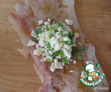Выложить немного начинки на подготовленное филе, свернуть рулетом.