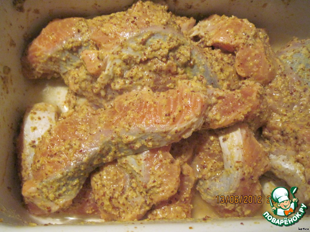 Для начала рыбу режем на тонкие полоски в ширину с большой палец и маринуем в горчице, будет вкуснее, если брать горчицу в зернах.