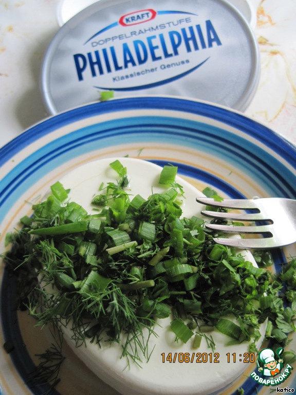 Свежую зелень порезать и смешать со сливочным сыром, посолить смесь по вкусу.