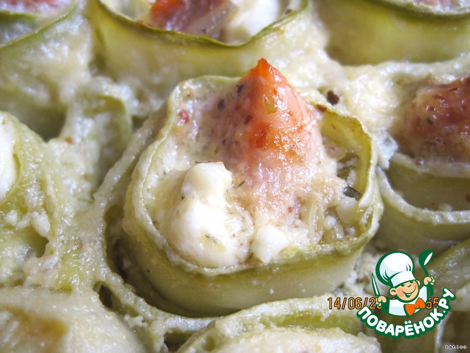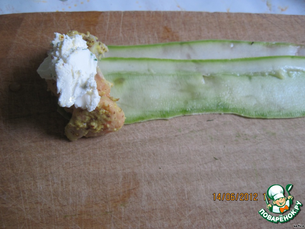 Несколько кабачковых лент выкладываем внахлест, кладем кусочек рыбы, сверху - 0,5 чайной ложки сливочного сыра с зеленью и сворачиваем в рулетик.