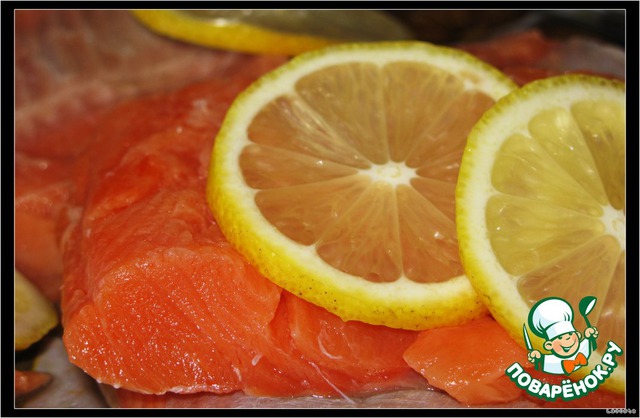 Филе рыбы нарезать на порционные куски, посолить, добавить специи и сбрызнуть соком лимона.