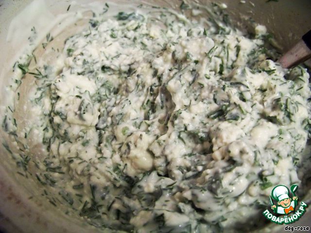 Для приготовления творожного крема мелко нарезаем зелень (как вариант – измельчить в блендере). Творог солим, разминаем вилкой, добавляем к нему зелень и стаканчик йогурта.