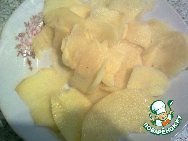 Картофель нарезать тонкими пластинками по длине (по возможности) или натереть на терке для чипсов