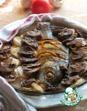 Грибы нарезать тонкими пластинками, "укрыть" ими овощи. Посолить, поперчить, полить оливковым маслом. В форму налить теплую воду. Нагреть духовку до 160-170 градусов, поставить в нее форму с рыбой и запекать 50-60 минут.