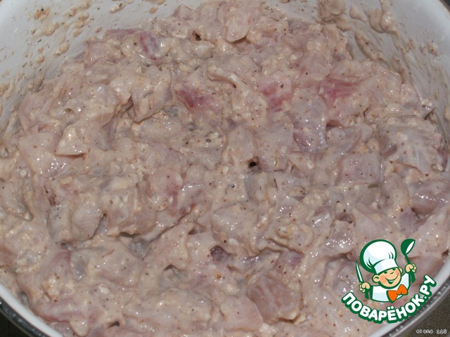 Добавить к рыбе взбитое яйцо, овсяные хлопья, крахмал, молоко (сливки), муку, соль, перец и приправу.