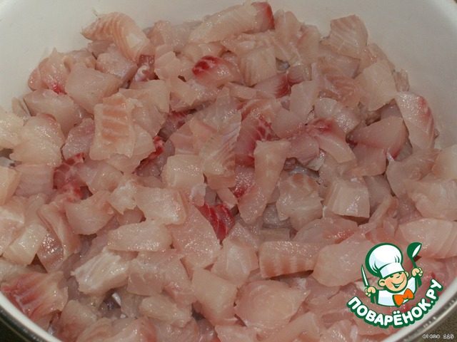 Филе помыть, обсушить и порезать на маленькие кусочки. Сложить в миску.
