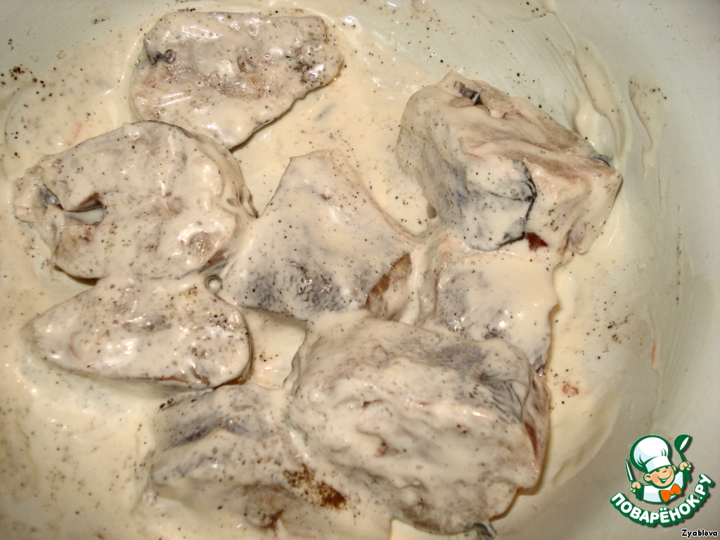 Режем порционно рыбу, маринуем. Добавляем соль, перец.