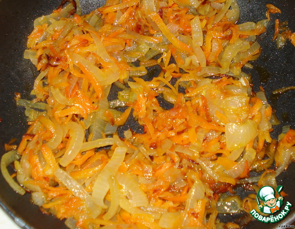 Пока рыбка маринуется, жарим морковь с луком. Еще по желанию можно добавить грибы.