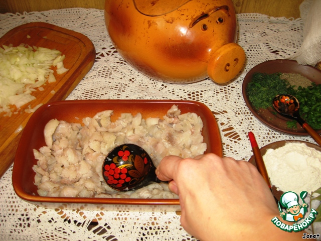 Необходимо филе нарубить кусочками размером не более 0,5 х 1 см, лук репчатыймелко мелко порезать.