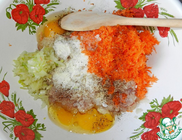 Морковь и лук очистить. Морковь натереть на средней тёрке, лук на крупной или перебить блендером. Добавить к фаршу. Вбить два яйца. Посолить и поперчить по вкусу.