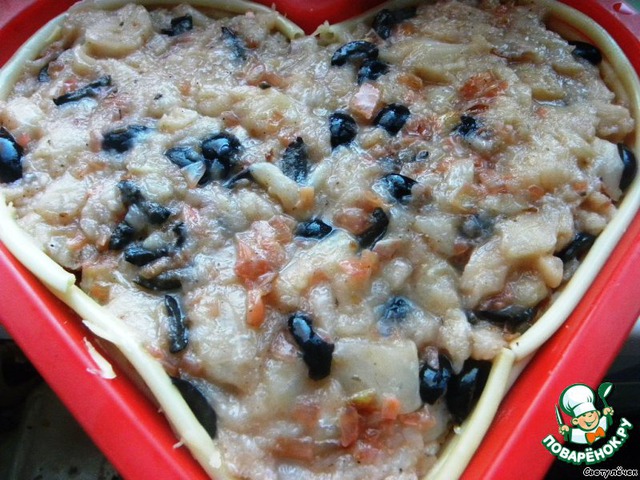 Филе минтая мелко режем, добавляем обжаренный лук, чеснок, томат с маслинами, добавляем взбитые яйца и сливки, соль, перец по вкусу, всё перемешиваем.