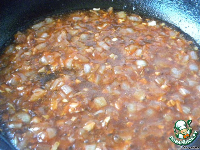 Лук и чеснок режем и обжариваем, добавляем кетчуп или томатную пасту