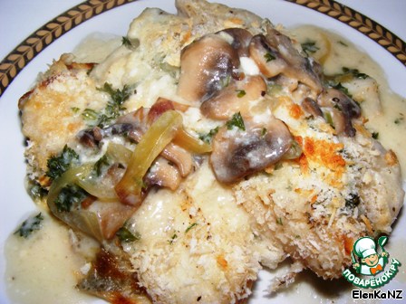 Филе рыбы сполоснем холодной водой и положим на шампиньоны. Посыплем зеленью петрушки, добавим соль, перец, лавровый лист и тимьян.