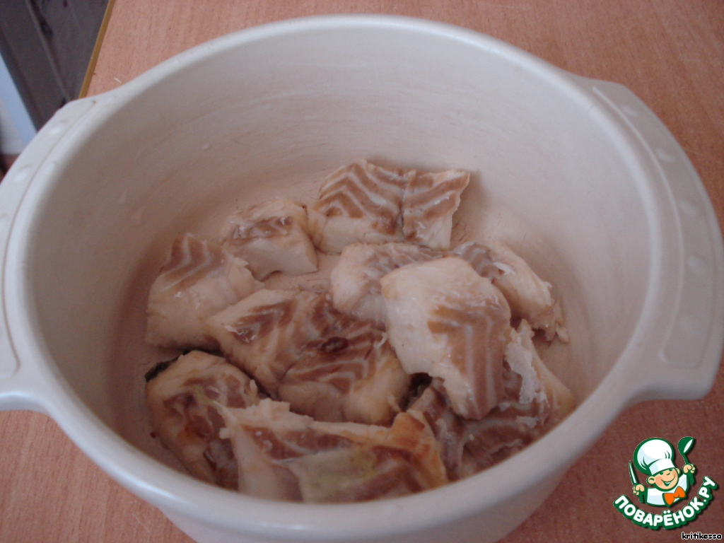 Итак, берём треску, удаляем чешую, промываем и нарезаем кусками вместе с кожей и костями.