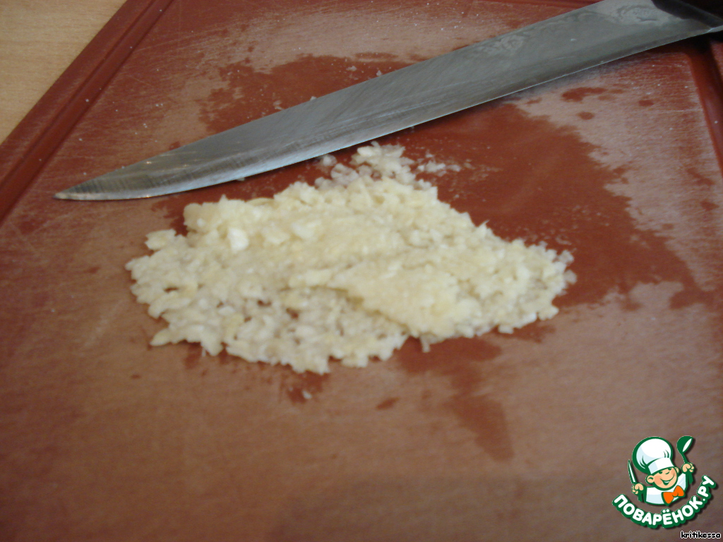 Почистить чеснок, мелко порезать, посыпать солью и растереть плашмя ножом. Можно и через пресс, но я не люблю чеснокодавилки, мне кажется, что когда чеснок подавишь с солью, он становится более ароматным.