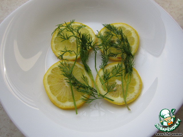 Сверху на них помещаем куски сёмги, снова прикрыв верх рыбы лимоном и укропом.