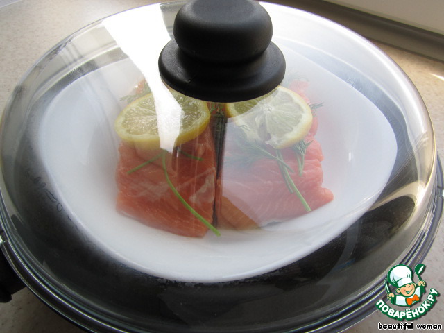 На кольцо из фольги ставим тарелку с рыбой. В сковородку наливаем два стакана воды, накрываем плотно крышкой и, доведя до кипения, варим ровно 7 минут.