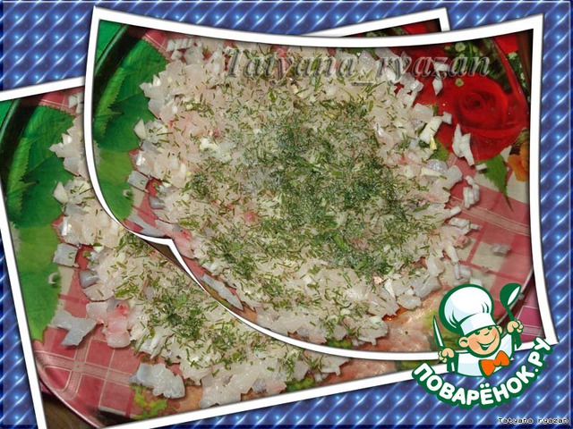 Филе рыбы нарезать маленькими кусочками. Добавить измельченный репчатый лук и мелконарезанный укроп.
