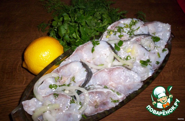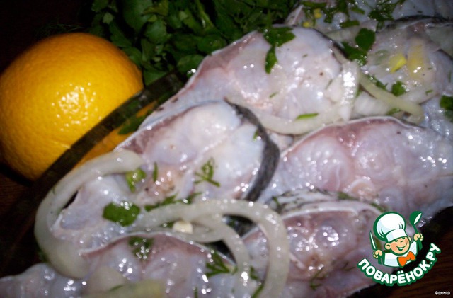 - рыбу почистить, тушку порезать на кусочки толщиной 1 см. (см. пошаговые фотографии), посолить, дать просолиться 2 часа в прохладном месте, смыть соль под проточной водой - лук порезать полукольцами , залить раствором уксус + вода (100 мл. +100 мл. ), настоять 30 минут , слить маринад