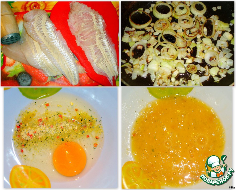 Филе хека немного отбила и разрезала на две части. Лук обжарила, хотя в оригинальном рецепте лук использовался свежим. При жарке лук чуть присыпала солёной смесью - приправой.